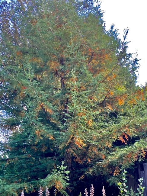 Onze kustmammoetboom oftewel Sequoia Sempervirens. Er werden nogal wat kleine takjes rod en bruin en ik was bang voor de gevreesde kever alhoewel ik geen sporen zag. Ik heb een mail gestuurd aan de tuinman van het Pinetum in Hilversum ( Als je kan ga er eens heen, een geweldig mooie en oude naaldbomen tuin) en kreeg een geruststellende mail terug..dat gebeurd gewoon af en toe bv onder invloed van periodes droogte en nat.. en schaad de boom verder niet. De boom is 20 jaar en iets van 15 meter hoog. We hebben nog een kustmammoetboom die heeft het minder.