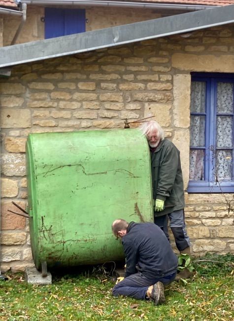 Onze warmtepomp werkt goed en de WW’ers konden ook nog helpen de oude tanken van de huisbrandolie naar buiten te slepen. Nu maar hopen dat de ijzerboer ze op wil halen.