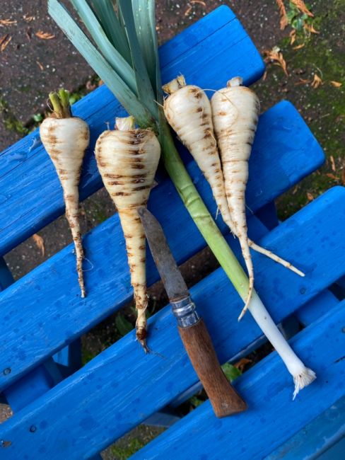 We plukken ook nog steeds sla, zei het met mate. Vooral winterpostelein en wat snijbiet en raapstelen. De spinazie groeit niet meer en de veldsla is ook beperkt.