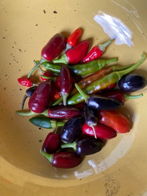we hebben de laatste tijd nog wel wat oogst verwerkt. Zo worden de pepertjes gedroogd. We hebben geen enorme oogst dit jaar, maar we komen een heel end zonder te kopen.