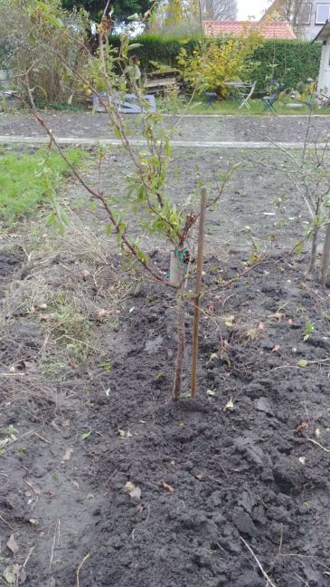 Vandaag gaan werken in mijn tweede tuin. Die ligt wat beschut in het rechthoekige binnengebied tussen huizen. En zowaar....een van mijn deze winter overgeplante bomen heeft al frisse nieuwe blaadjes. Het is de eigen zaailing plumcot van ca. 4 jaar oud. Ik ben zeer benieuwd naar de verdere ontwikkeling van deze wel heel vroege vogel, temeer omdat bij Prunus normaal de bloei verschijnt voor de bladeren....maar bloei zal er nog niet zijn....zaailingen bloeien meestal jaren later dan geente boómpjes. De bovenste foto is van 15 november...de dag dat het boompje weer is geplant vanuit mijn voormalige bostuin. De middelste foto, niet helemaal scherp, is hetzelfde plumcot boompje vandaag, 8 februari. Ik heb daarnaast nog een plumcot, die ik 2 jaar geleden kocht in Tjechie. Die staat in mijn grote fruittuin (tuin 3). Die laat momenteel nog geen knoppen die open zijn of snel open gaan, zien. Die gkochte plumcot zie je op de derde foto. Over een maand of 3 a 4 wil ik deze en andere Prunussen een flinke snoeibeurt geven voor een goede basisvorm. Ook zal ik de beste zelf gezaaide bomen via chip-budding proberen te enten om zo bloei en hopelijk fruit te versnellen. Of dat lukt is afwachten...vroege bloei is ook een risico van bevriezing. En sommige boompjes groeien slecht of zien er niet altijd gezond uit...die zal ik niet meteen vermeerderen. Vooral de japanse pruimen...de vruchten die ik kocht komen van rond de Middelllandse Zee....lijken niet echt geschikt voor dit klimaat....groeien niet altijd heel gezond. Ze stonden eerst in open gebied met veel (zee-)wind....nu staan ze althans in tuin 2 aanzienlijk beschutter...dat kan wel wat gaan uitmaken.