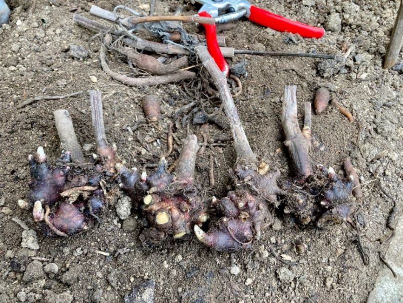 Enfin een heel verhaal om te vertellen dat ik al een beetje begonnen ben met opruimen in de kas, de laatste bietjes en wortels zijn opgegeten, er zitten nog wel wat yakonknollen in de grond. De yakon planten die ik ook had ingekuild in de kas vandaag opgegraven. Er zitten al aardige groeipunten aan. Ik heb de wortels ontdaan van achtergebleven stukjes knol en fliebertjes en de knolletjes in verschillende potten gedaan..ik hou ze nog wel droog.