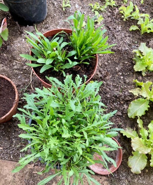Ook de twee verschillende rucola’s in het najaar uit de tuin gehaald en in de kas ingegraven staan nu weer in de pot.