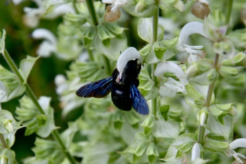 Nog een fotootje van de zwarte houtbij die eigenlijk blauw is. Het witte hoedje van de scharlei staat haar echt vinden jullie niet?