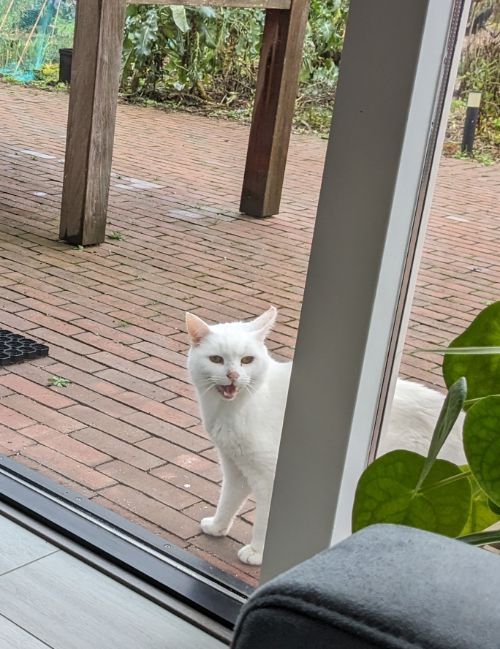 En af en toe hebben we bezoek van een van de buurkaters. Gezellige jongens hoor. Hun baasjes hebhen ook een moestuin, dus er gaan regelmatig plantjes, gereedschap of oogst over de heg.