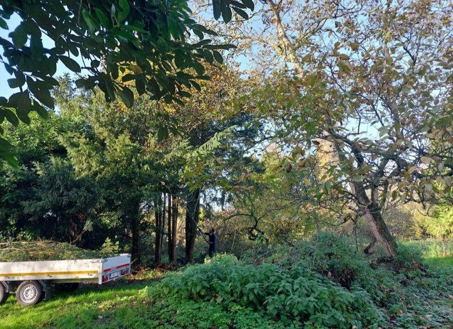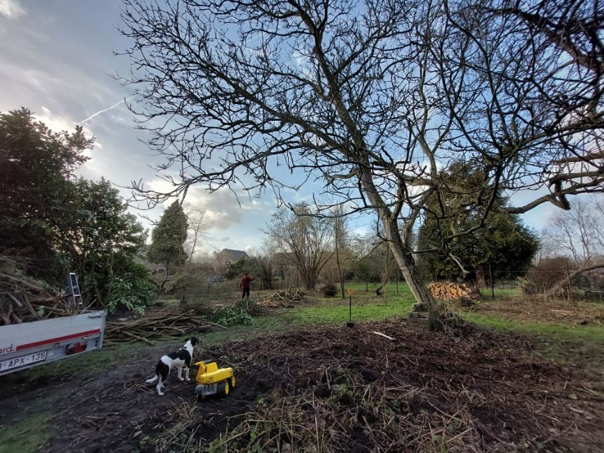 Op het stukje stonden heel veel braamstruiken en ook 4 grote taxusbomen en een wilg. We besloten deze weg om twee redenen. enerzijds komt er zo meer licht op het stukje grond en de achterliggende mooie oude notelaar. En aangezien we ook paarden hebben leek het ons wel een goede keuze om de taxus weg te doen.