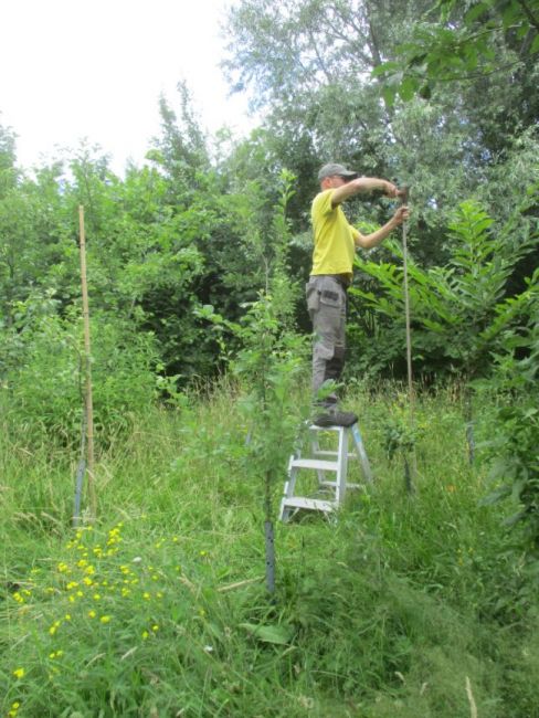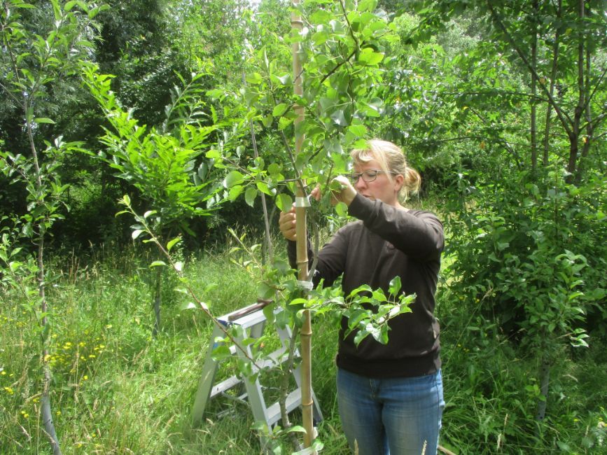 ) en ze daar aan vast gebonden om ze recht(er) te laten groeien. Het hoeft hier echt niet kaarsrecht allemaal hoor, maar sommige bomen maken er wel een potje van.