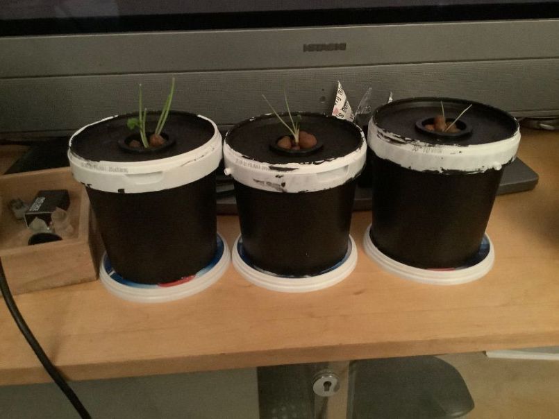 Vandaag de eerste hydroponic plantjes in de grond in het water gezet. Spannend! De eerste mislukkingen zijn er al; omdat hydroponics zo veel mogelijk lichtdicht moet gebeuren (tegen de algen)  had ik yoghurt emmertjes met gesso bewerkt - een soort hecht-op-alles verf - en daarna met zwarte verf.  Fail. Daar waar water de kans kreeg ruineerde het de verflaag. Mijn huidige plantjes staan niettemin in deze emmertjes. Van een van de creagroepen kreeg ik de tip eea met ducttape te doen - dat klinkt veelbelovend. Aluminiumfolie kan ook. Ik ga het allemaal  uitproberen. Andere tips ook welkom.