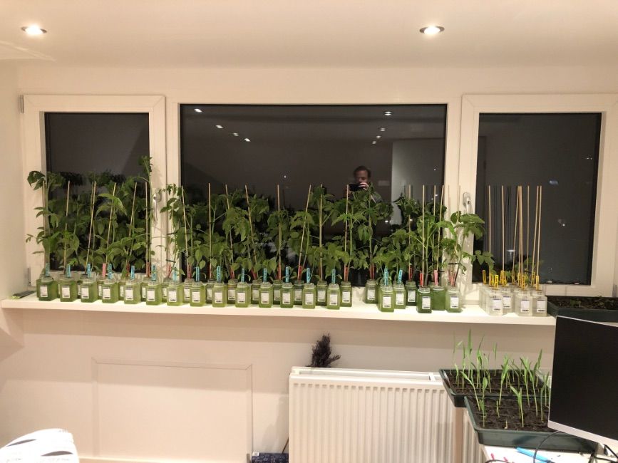 Dit jaar had ik volgens mij iets van 70 flesjes met tomaten en paprikaplanten op de vensterbank, 65 ervan zaten vol met algen na 2,5 maand kweek. Soms nog groener dan groen. Uiteindelijk hebben ze allemaal fantastische oogst opgeleverd.