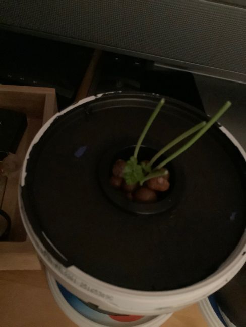 Kleine potje met perliet is het zaadje in ontkiemd. Gouden deksel, was de deksel van het kleine potje. Te laat overgezet naar grote emmer, kreeg wortels niet meer terug door het gat van gouden deksel. Uiteindelijk maar laten zitten. Volgend jaar daar dus beter op letten.