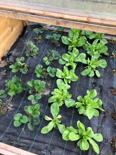 hieronder mijn sla, andijvie en bietjes die buiten zijn gezaaid. Erachter de nieuwe sperziebonen planten die al een kg hebben opgeleverd.