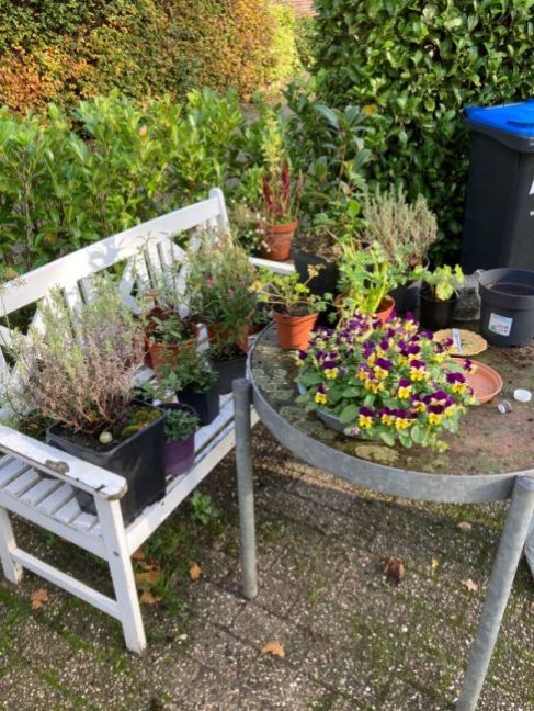 In de loop en vanaf de MTFD heb ik nog wat kruiden verzameld die mee mogen, die hoop ik hier van de winter in leven te houden, eventueel tegen de muur van ons huis. Selderij, kuif lavendel, laurier, tijm, rozemarijn, majoraan, lavas, bieslook en peterselie.