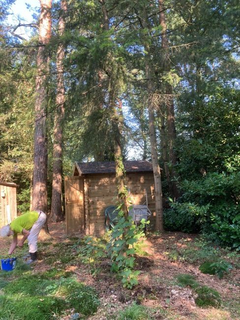 Die hebben we geplant in een zinken emmer en idem wasketel. Onderin een laag half vergaan hout dat hier overal ligt. De opbrengst, niet gewogen, is best aardig we hebben er verder niet zoveel aan gedaan, 1 x gemulched met grove dennennaalden en een paar x vanuit de verte de waterstraal erop. Ze stonden gewoon aan de rand van het bos de laatste 5 weken in de schaduw omdat we er niet waren.
