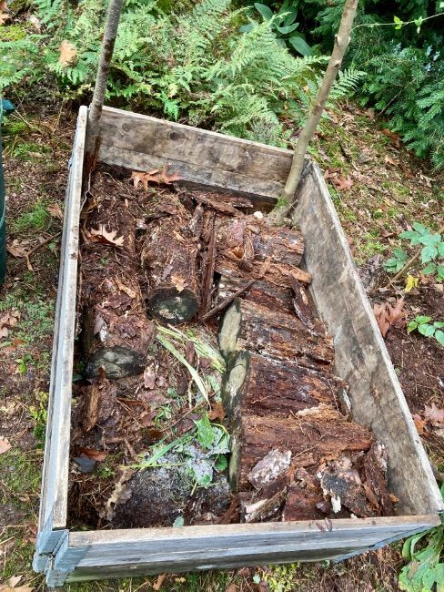 We hebben in ons bosje veel “loslopend” hout in de vorm van uit de bomen gevallen takken en twijgen en verder door eerdere bewoners in stukken gezaagde grove den. De laatsten beginnen al wat te vermolmen prachtig materiaal om de onderste helft van de bakken mee te vullen. Deze derde bak wil ik van 4 randen op elkaar maken en ik heb geen haast, de hele winter kan ik er nog materiaal, sintels uit de kachel, blad, takken, keuken afval, afknipsels van de hagen en waar ik nog meer mijn hand op kan leggen, om aan het eind van de winter, of misschien eerder de nu nog half gare compost erop te leggen.