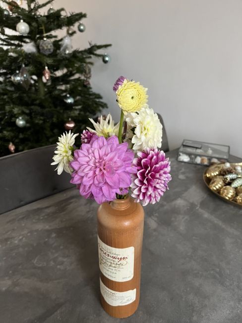 De laatste bloemetjes van de dahlia's op een vaasje gezet: