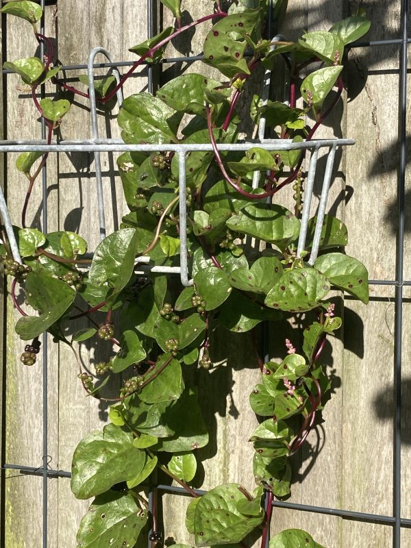 8 juli: De 4 plantjes Malabar uit de bak gehaald en die in 2 kleinere bakken in de tuin gezet.