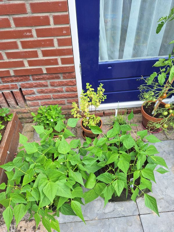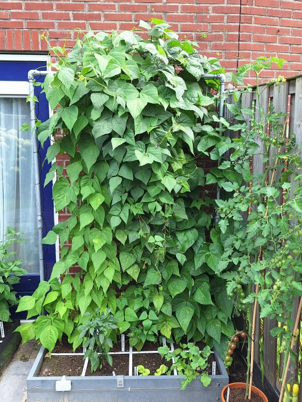 Je ziet het niet op deze afstand. Maar de bonen zitten vol met bloemen. Dus binnenkort flink bonen plukken en eten en invriezen.