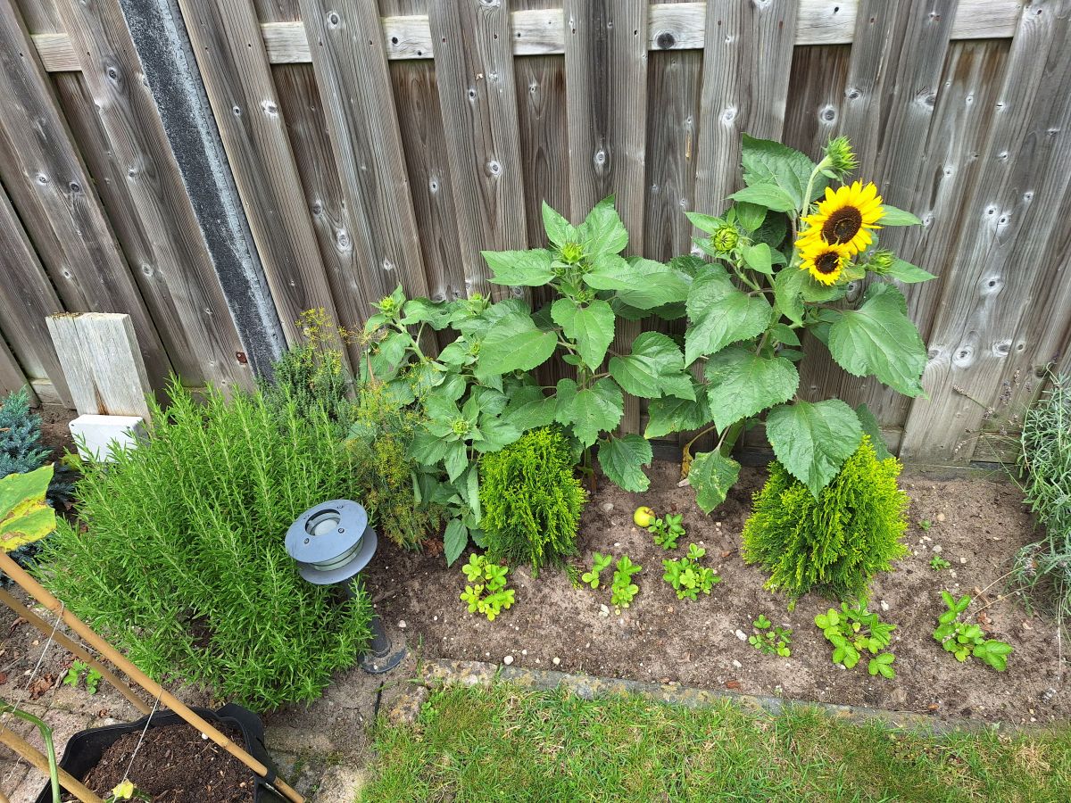 De lage zonnebloemen zijn ook begonnen met bloeien. Een stuk eerder dan vorig jaar. Toen pas ergens in september bloei. Op de voorgrond heb ik de witte bosaardbeien gepland. Dit zijn zaailingen van de planten van vorig jaar.