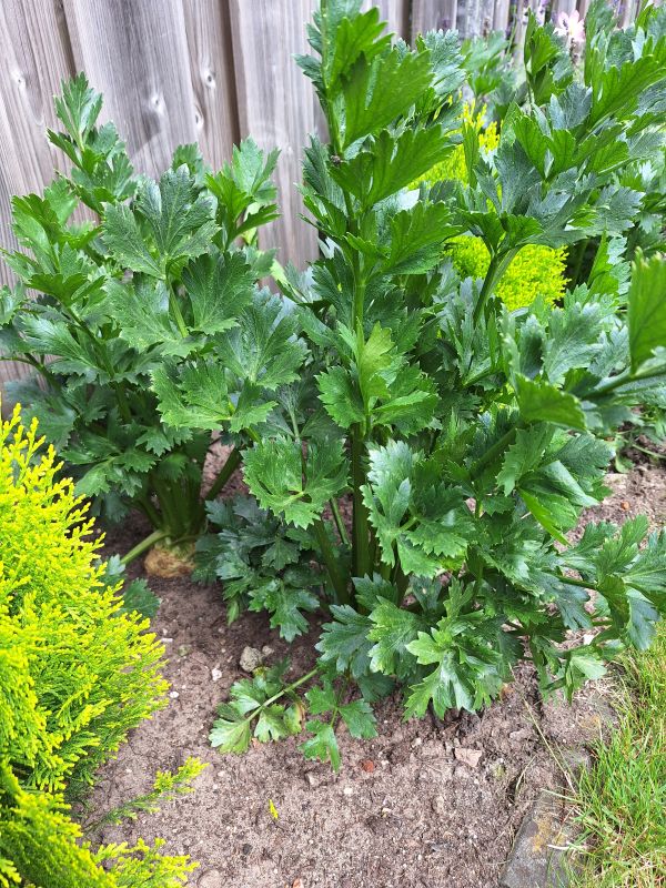 De knolselderij groeit goed. Er zit al een mooie knol aan. Van de 6 heeft er 1 in de vakantie het opgegeven. Geen idee wat ermee is gebeurd. 5 is ook prima.