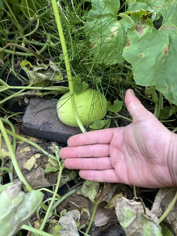 Hoeveel meloenen zijn hier zichtbaar aanwezig op de eerste foto en hoeveel heb ik er totaal gespot in de 4m2 waar de meloenen kunnen groeien?