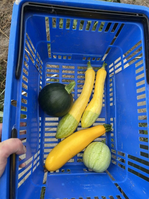 Courgetteplanten geven verrassend veel courgettes nog aan het einde van het seizoen: hier mooi de 4 verschillende soorten te zien: