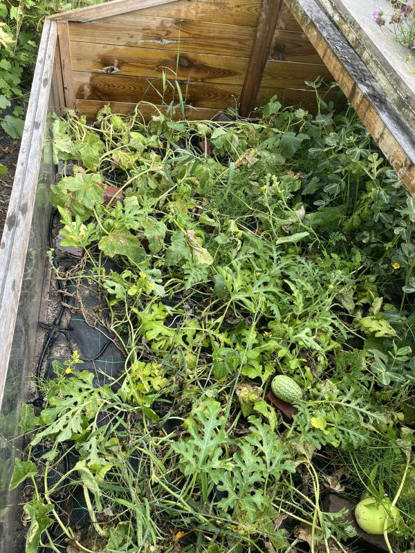 De planten zelf zijn een beetje ‘op’, maar ik denk dat we met 20 meloenen eindigen tussen formaat tennisbal en iets boven een grapefruit: