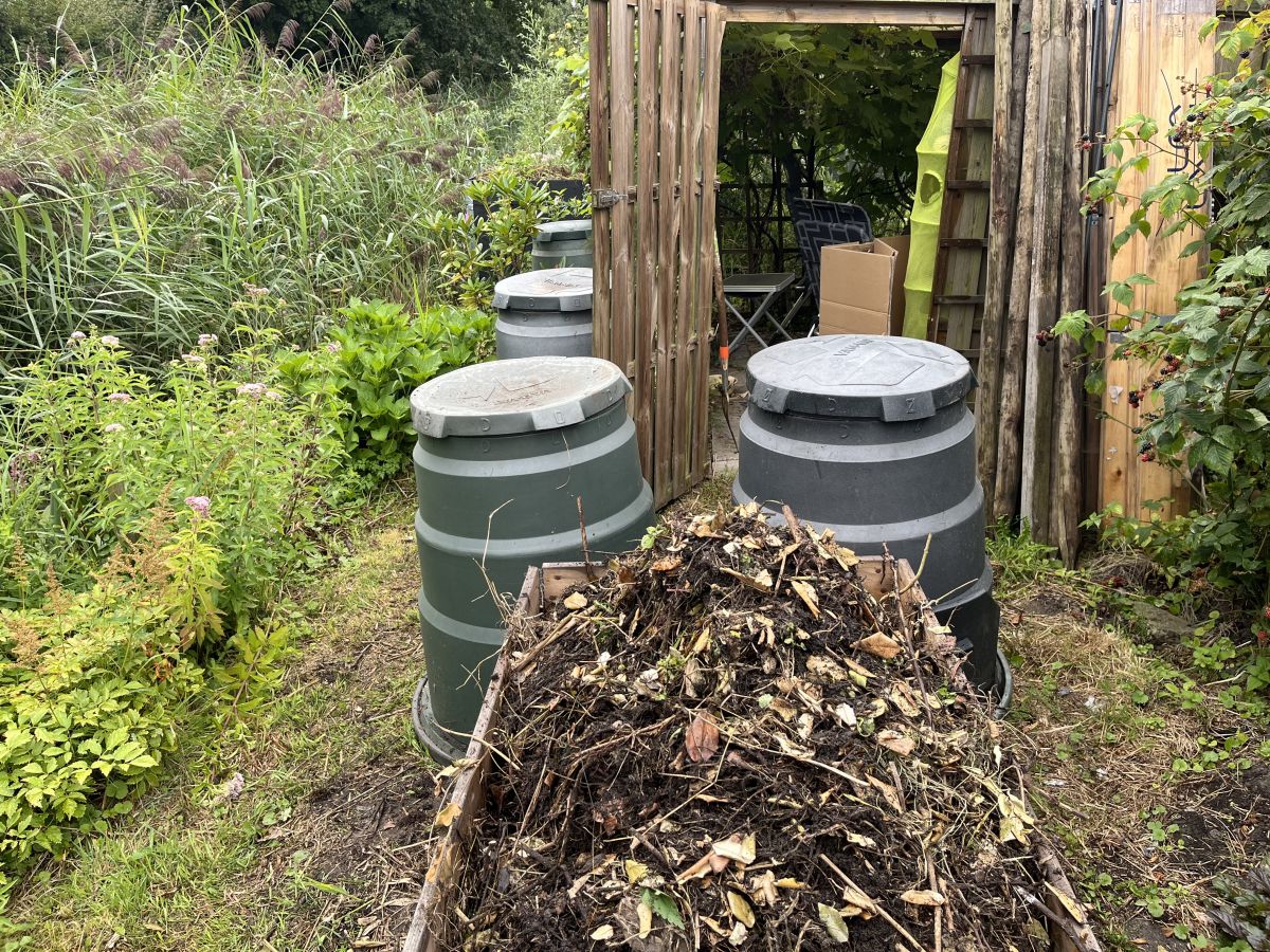 Op advies van jullie de compostbakken naar achter de bramenhaag verplaatst en ben ik nu netjes aan het vullen. (in de eerste weken heb ik dikkere takken onvoldoende klein gemaakt dus dat doe ik nu alsnog..)