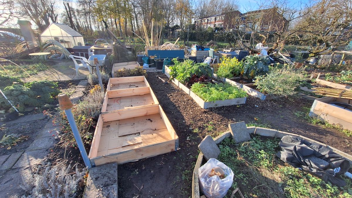 Vandaag, 4 december, heb ik 8 nieuwe verhoogde bedden gemaakt. Ik moest eerst de grond level krijgen, aangezien er planten en paden verwijderd zijn. Daarna karton neergelegd en de palletranden erop geklungeld. Alles ligt behoorlijk waterpas.