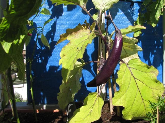 De wedstrijdaubergine (Fengyuan Purple, het banaan-achtige type) groeit nauwelijks meer: een halve centimeter erbij in een week. Aan de dag- nachtwarmte kan het niet liggen. Over een paar dagen gaat ie eraf, en wordt officeel ingezonden