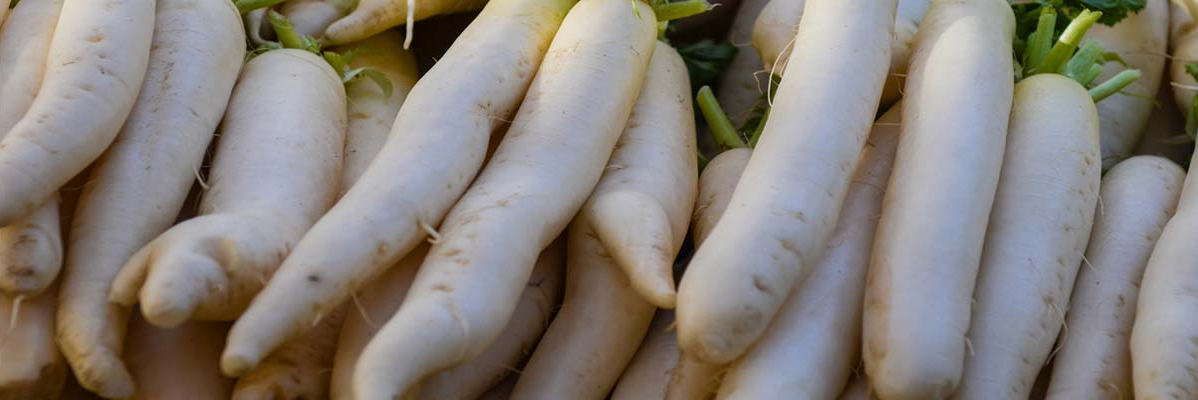BemestenRammenas en daikon zijn snelle groeiers en vragen geen zware of speciale bemesing. Ze groeien prima op restmestof uit het vorige seizoen. Geef in ieder geval nooit een verse bemesting door meteen na bemesten te zaaien. Werk liever in de herfst de bemesting door de grond. Een te veel aan stikstof is nadelig voor de groei van de knol omdat het plantje dan meer loof aanmaakt. Bijmest tijdens de teelt is eveneens niet nodig.OogstenOogst naar behoefte maar laat ze niet te groot en oud worden. Het beste zijn deze groenten te oogsten met een spitvork zodat je de lange wortels geheel uit de grond kunt halen. De bewaarbaarheid verschilt per ras maar deze is over het algemeen beter dan bij radijs. |