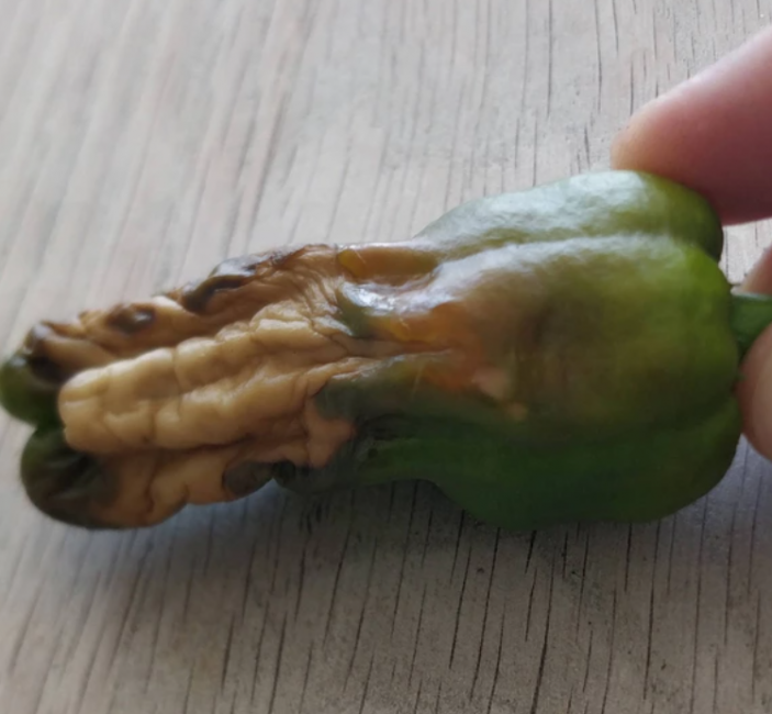Onderzoeksresultaten suggereren dat als calciumgebrek optreed, de eerste tekenen van neusrot pas twee weken later zichtbaar zijn aan het fruit. De aantasting komt geleidelijk. Zijn de pepers van de één op de andere dag "blaarachtig/wit"? Dan zal dit eerder komen door zonverbranding. |