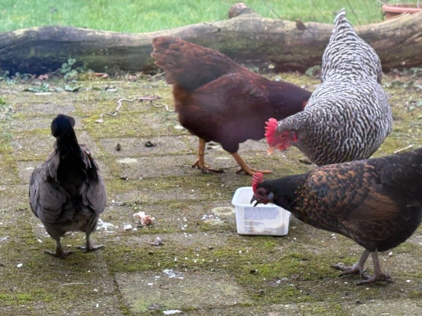 Als iemand medium kippen zoekt (te grote krielen) die goed leggen en niet broeds worden kan ik de Amrocks uit Lunteren aanbevelen. Adverteerde in het voorjaar op MP met broedeieren. Een is nu in de rui en gestopt met leggen. De andere legt nog steeds, vanaf het najaar van 2024. Ik vindt ze lomp groot naast mijn hollandse krieltjes maar het gaat wel heel goed samen nu ze 2 hokjes hebben , zodat ze kunnen kiezen waar ze gaan slapen. De laatste tijd is het steeds zo verdeeld: In het speelhuisje de 2 Amrocks en 2 (niet raszuivere) Hollandse krielen. In het oude hok slapen de 3 oude Hollandse krielen en de Rhode Island red kriel. Lekker, die aangekoekte kaasfondue op de bodem.