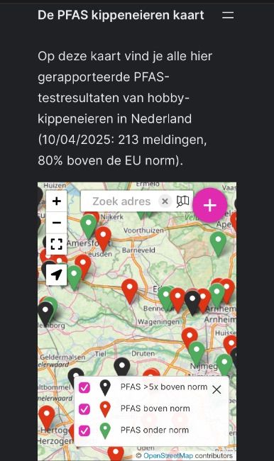 Omdat het over kippeneitjes gaat wil ik hier toch graag delen dat de goedkope PFAS-eier test van 100 euro inderdaad vrij waardeloos is. Ze geven aan dat er in mijn ei teveel PFOS zit (meer dan 1,5 microgram/kg). De waarden van de andere PFAS soorten die zijn getest zijn wel okay/redelijk. Ik wil hier graag aan toevoegen dat PFAStest.nu geen cijfers deelt over de ernst van de besmetting (in microgram/kg). Ze geven alleen een stoplicht-indicatie. Goed, twijfelachtig, slecht. En ze volgen daarbij niet de Europese richtlijnen voor PFOS. Voor een beter resultaat adviseren ze een uitgebreide test van ca € 285. Tot nu toe weigert pfastest.nu de gemeten uitkomst in cijfers te delen.