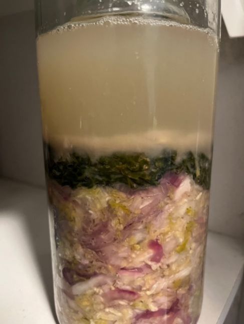 Hallo, Ik heb drie dagen geleden van een grote savooie kool voor het eerst zuurkool gemaakt. Met een rode uit erdoorheen. Bij een recept gelezen dat je de kool kunt afdekken met een buitenste blad. Daarop heb ik nog een potje met water gezet. Nu drijft er echter een wittige drab boven het koolblad. Ik heb dit nog nooit eerder gedaan, dus weet niet of dit normaal is of niet. Komt dit door de ui? Ik heb vanmiddag geprobeerd het weg te scheppen, maar het verdwijnt helemaal in het water zodra ik iets roer. Daarnaast direct een tweede vraag: moet ik dit koolblad nog vervangen na een week ofzo? Of afspoelen? Of gewoon laten zitten en de natuur z’n gang laten gaan? Hoop zo dat het lukt en lekker smaakt!
