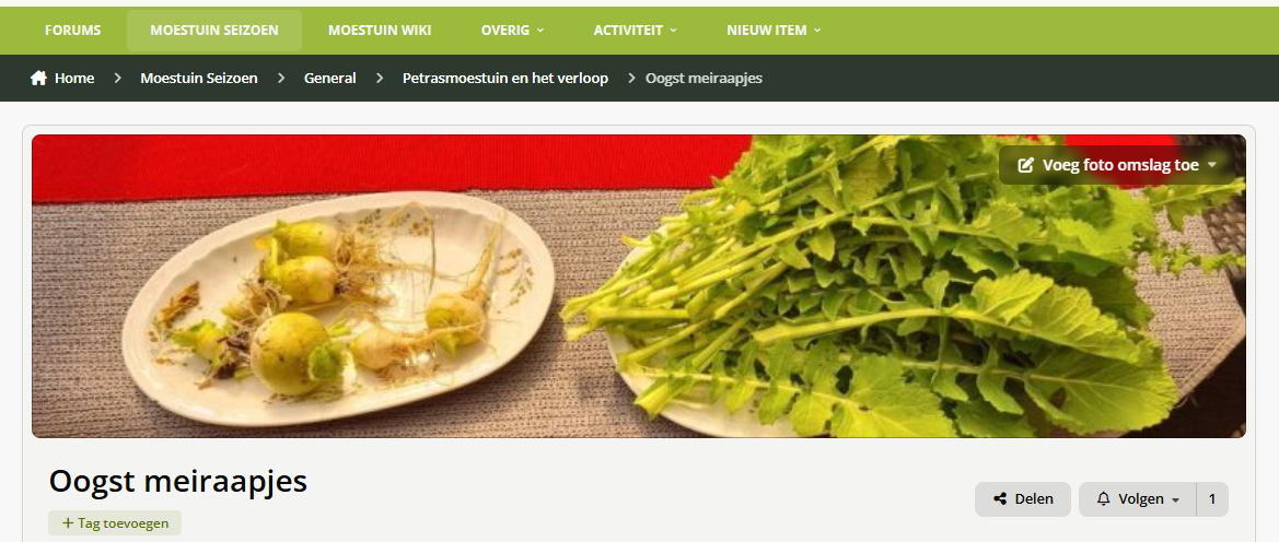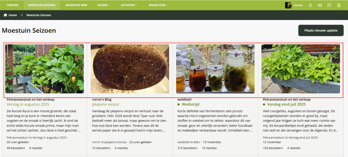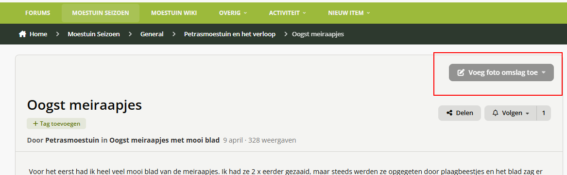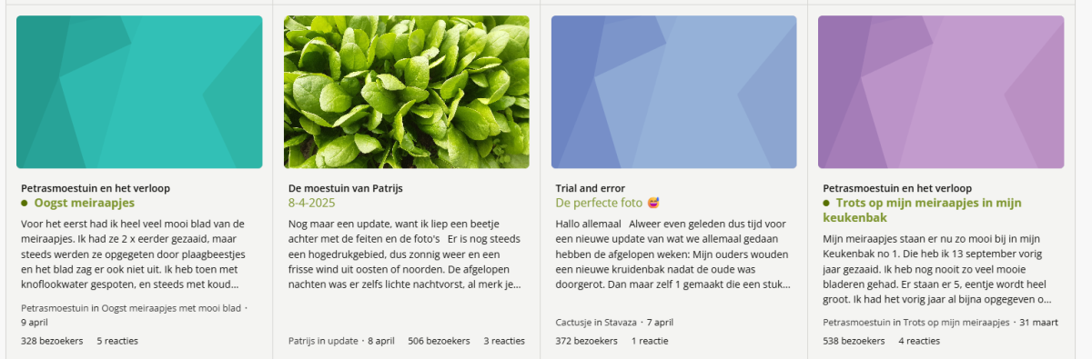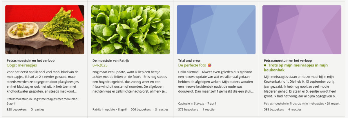 25. Hoe kan ik een omslag/cover foto toevoegen bij mijn moestuinseizoen. Als er een nieuwe moestuinseizoen (blog) aangemaakt, kan je onderaan een omslag foto toevoegen: Als je een bestaand moestuinseizoen wilt wijzigen, kun je dit direct op de pagina zelf doen. Klik dan op de knop "Voeg foto omslag toe". Waarvoor is de omslag foto bedoelt? De foto wordt gebruikt op drie plekken. Boven aan in de blog post zelf: In het overzicht Moestuin Seizoen: Op verschillende pagina's aan de rechterkant van het scherm. Op mobiel is dit op verschillende pagina's helemaal onder aan de pagina. Voorbeeld van geen foto omslag in een overzicht; Na het toevoegen van een foto omslag: Wat als ik geen omslag foto toegevoeg? Dan kan het zijn dat een moderator een foto van jouw moestuinseizoens post gebruikt om deze toe te voegen. We doen dit om te zorgen dat er een foto wordt weergeven in de verschillende overzichten. Zie kopje hierboven 'Waarvoor is de omslag foto bedoelt?"
