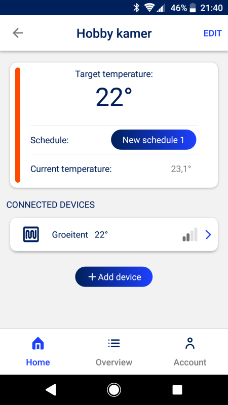 6. Via schema in te stellen. Dag/nacht. Voor nu, als nacht is lampen staan uit. Op 19c. Als lampen aan staan op 22. Als verearming ingestelde temp gehaald heeft en uit gaat, dan loopt temp nog 1,5 graden op. En daarna zakt het langzaam weer af. Ik zal dat morgen eens testen door de verbruiksmeter er tussen te hangen!