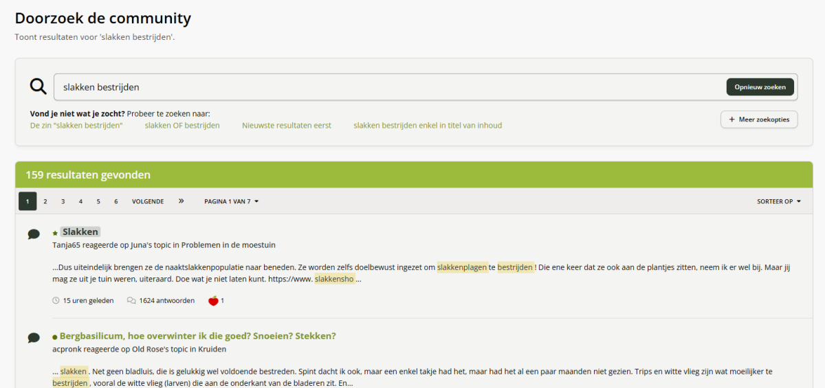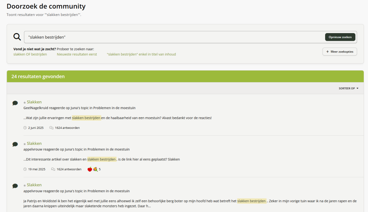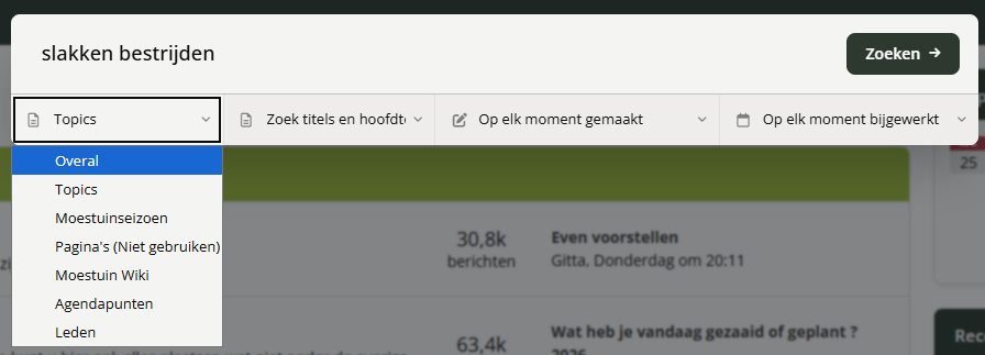 Hoe kan ik een zin of een deel van een zin zoeken? In het kort: zet de zin of deel van de zin tussen quotes, bijvoorbeeld: "slakken bestrijden". Uitgebreide uitleg: Druk op de knop 'Zoeken'. Als je al in een topic zit, kan het zijn dat je alleen binnen het topic gaat zoeken. Als je de hele website wilt doorzoeken, zorg er voor dat je "Overal" selecteert. Om meteen een zin of deel van een zin te zoeken, zet je er quotes omheen: Wat gebeurt er als ik zonder quotes zoek? Dan gaat de zoekfunctie zoeken naar elk woord wat je in de zoekfunctie opgeeft en of één van die woorden voorkomt in het bericht. Dit kan dus een bericht zijn, met alleen het woordt "slakken" of alleen het woord "bestrijden". Je zult op deze manier heel veel zoekresultaten krijgen, en de berichten die over "bestrijden" gaan, gaan dan misschien niet over slakken. Zie hieronder het verschil. De twee losse woorden zoeken: Of een zin of een deel van een zin zoeken, waarbij deze optie minder resultaten geeft, maar wel exact resultaten toont waar je naar zoekt.