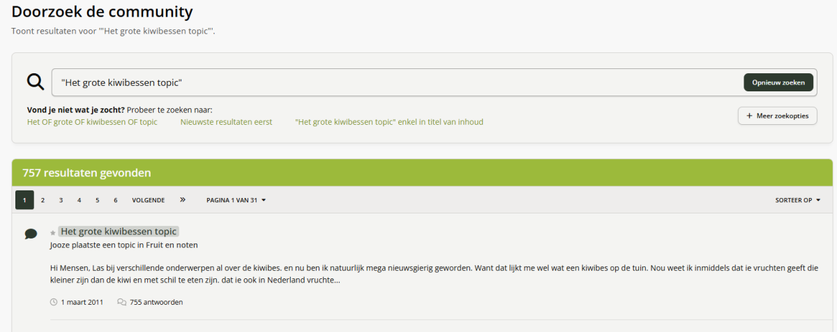 Hoe kan ik een topic op naam zoeken als ik de exact naam hiervan weet? Druk op de zoekfunctie, zoek bijvoorbeeld naar: Het grote kiwibessen topic. Zorg dat de tekst tussen quotes staat, zodat je de gehele zin zoekt. Lees ook: Hoe kan ik een zin of een deel van een zin zoeken? Controleer ook waar je zoekt, zorg dat dit op "Overal" staat. (Meest linker veld) Druk dan op Zoeken. Het resultaat van de zoekactie is dat je de exacte zin hebt gezocht in de titels van topics. Hiermee krijg je direct het gezochte topic te zien in de resultaten.