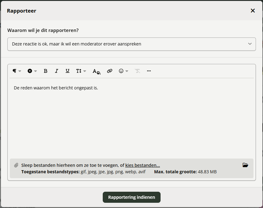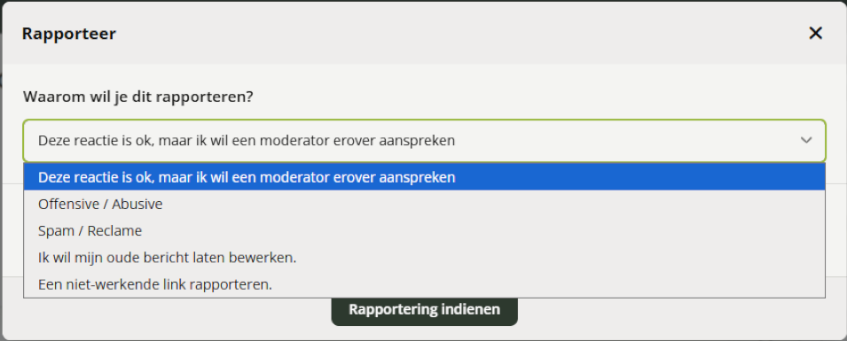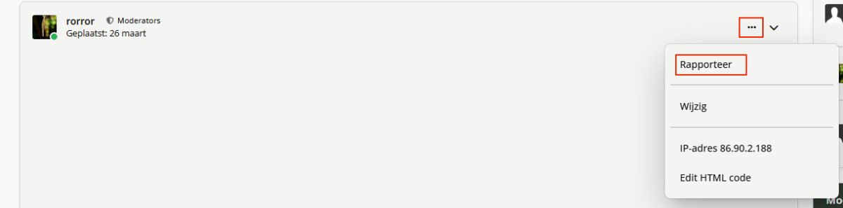 Hoe kan ik een reactie wat ongepast is rapporteren aan moderators? Ongepaste berichten kunnen gerapporteerd worden aan moderators. (Geldt ook voor privé berichten) Dit kunnen bijvoorbeeld overtredingen van huisregels zijn, of van de algemenevoorwaarden. Ook berichten die off-topic zijn kunnen gerapporteerd worden. De moderators op het forums zullen hierna actie ondernemen. Er hoeft dan in het topic geen dicussie tussen gebruikers te ontstaan hierover. De moderators hoeven daarna dan het topic ook niet meer op te schonen, en dar scheelt veel dubbel en onnodig werk. Hoe rapporteer ik een bericht? - Klik op de drie puntjes "..." - Klik op "Rapporteer" Kies één van de categoriën: Geef de reden op, waarom dit bericht ongepast is. Druk hierna op "Rapportering indienen"