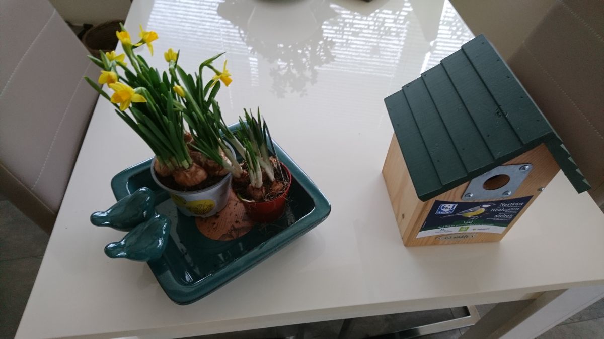 Nieuw huisje voor de koolmeesjes. Voederschaal wat ik ga gebruiken als bonsaischaal was 7.99€, 10x goedkoper dan echte schalen... Moeten nog wel afwateringsgaten in geboord worden. Wat er inkomt te staan, heb ik nog geen idee over. Tuincentrum heeft altijd wel een kar staan dat als je een aankoop doet, je een plantje mag meenemen, dus ik en vriendin afzonderlijk betalen en elk een plantje. 😊
