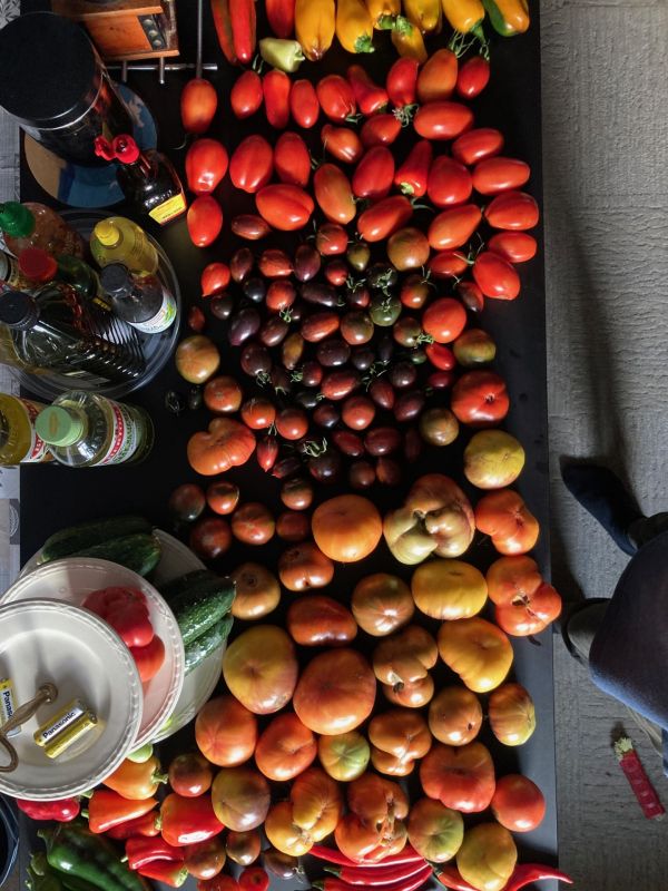 Opbrengst van vandaag gaan we morgen verwerken, het einde is inzicht de eerste 10 tomatenplanten zijn geruimd geen ziekte gelukkig, waren snoeptomaatjes daarvan had ik woensdag nog een 5 liter emmer vol van.