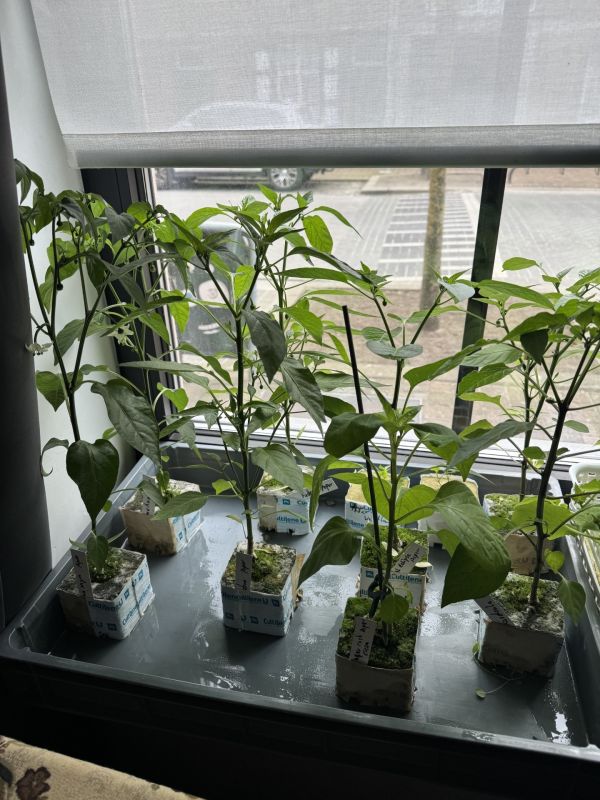 Hier staat alles sinds het paasweekend in de kas en doen het goed. zelfs in de komkommer of augurk is al de eerste bloem gespot. Ik monitor de pottemperaturen actief en die zijn in de ochtend rond 10 uur als de deuren open gaan 7 a 11 graden en rond 18 uur als ik de deuren sluit rond de 18/20 graden. Tomaten pepers paprika komkommer en augurk hetzelfde regime.