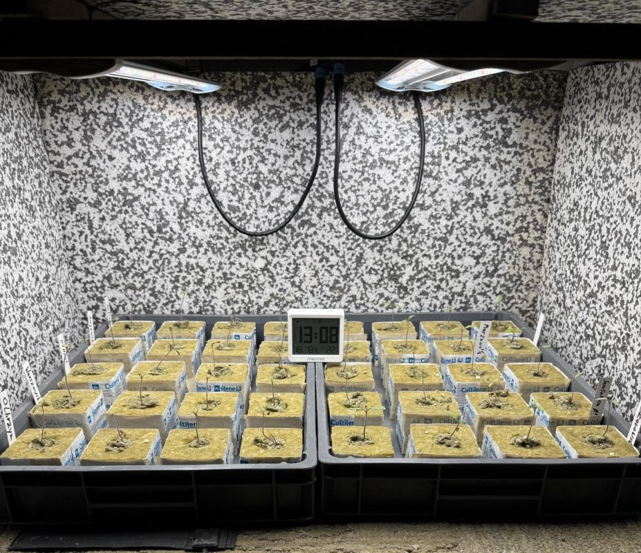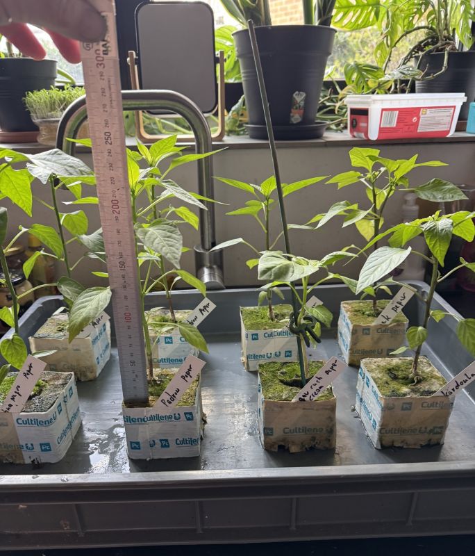 Dit is de batch peper/paprika gezaaid op 11 januari 2026, 1ste week op een verwarmingsmat en gesloten kap voor kieming vanaf week 2 14 uur per dag licht erop. De 4de week pluggen in blokken geplaatst en voeding in watergift. planten krijgen alleen groeilicht. Met wat kopspelden in de hoeken zijn de isolatiepanelen snel in elkaar te zetten en te verwijderen maar helpt om 27 graden overdag aan te houden en is het vele licht ervan niet storend meer.