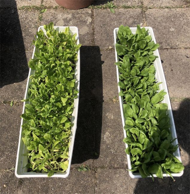 22. Ik ben vooral op dit forum om te leren.. Links, spinazie, 2 maanden geleden gezaaid en inmiddels al 3-4 keer geoogst. Rechts, spinazie, 2-3 weken geleden gezaaid, 0 keer geoogst. Links: was perfect groen, maar verkleurt meer naar geel nu Rechts: mooi donkergroen Waar zou de oorzaak van de verkleuring liggen? Heeft dat meer te maken met de plant zelf (regeneratie), felle zon van afgelopen weken of het verbruiken van aanwezige voeding in bodem? edit: niet zo heel duidelijk te zien op foto helaas.. Links oogt echt geliger