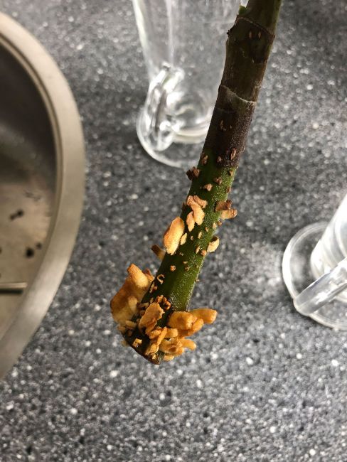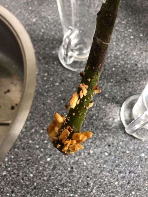 21. Ik heb twee jonge takken van een hoge vijgenboom gesnoeid, om er stekken van te maken. De takken hebben in een glas water gezeten (verschoond per week) en zo'n 3-4 weken later is dit het resultaat. Er steken vreemde dingen uit die eraf brokkelen als je eraan peutert. Dit zijn vast geen wortels of wel?