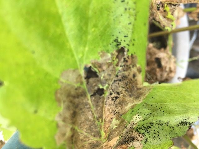 Ik heb pastinaak onder een insectengaas staan en een aantal in een grote pot die niet onder het gaas staan. Deze in de pot vertonen dit probleem, wat is dit?