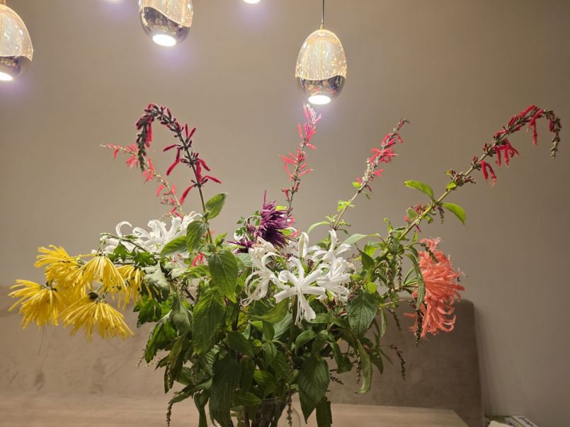 Bosje bloemen (chrysant was plat gewaaid, dus die is krom gegroeid), alleen de ananassalie is geen echte snijbloem, die kan niet zo goed tegen droogte. Blad van yakon, en nu ik toch takken van de ananassalie meegenomen had, ook blad ervan te drogen gelegd (zonder voedseldroger, dus even kijken hoe dat gaat). En speciaal voor @Mellie , blad van mijn kweepeer (Kwee A geloof ik, een onderstam voor peren). Zijn ze zo goed rijp?