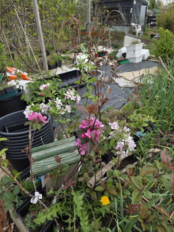 De afgelopen 2 keer dat ik naar de moestuin geweest ben, heb ik fruitbomen geënt. De eerste keer was dat pitfruit, dat was 3 weken en 2 dagen geleden (of een week eerder, dat weet ik niet meer precies). Toen heb ik het volgende geënt: Perzik Amsden, Russische pruimen Komeet en Rose of July, Cherrykot Braveheart, en Pluot Globus. Allen van @Bartoh , mijn dank daarvoor. Ze staan allen op Wangenheim of St. Julien A, ik weet niet meer welke, maar het is een uitgelopen onderstam van mijn enkele jaren eerder geente Bleue de Belgique en Monsieur Hatif. En het zijn nu familiebomen geworden. Daarnaast heb ik kersen geent, maar wel enthout van mezelf. Dit zijn Regina (van fruitbomen.net), en Sunburst en Stella (tenminste, als de labels kloppen want deze kwamen van Aldi of Lidl, maar het zijn in ieder geval geen zure kersen). De kersen hebben nu gezwollen knoppen, en de andere krijgen al blad. Ik ben voorzichtig optimistisch dat 100% geslaagd is. Zie foto's hieronder. En 2 weken geleden heb ik ook nashi en peren geent op Kwee Mc en zaailing. De beide nashi's (Tama en Benita) lopen net uit, terwijl de Charneux (peer 2 op de foto) net de knop op de top laat zwellen en de winterrietpeer nog helemaal niets doet.