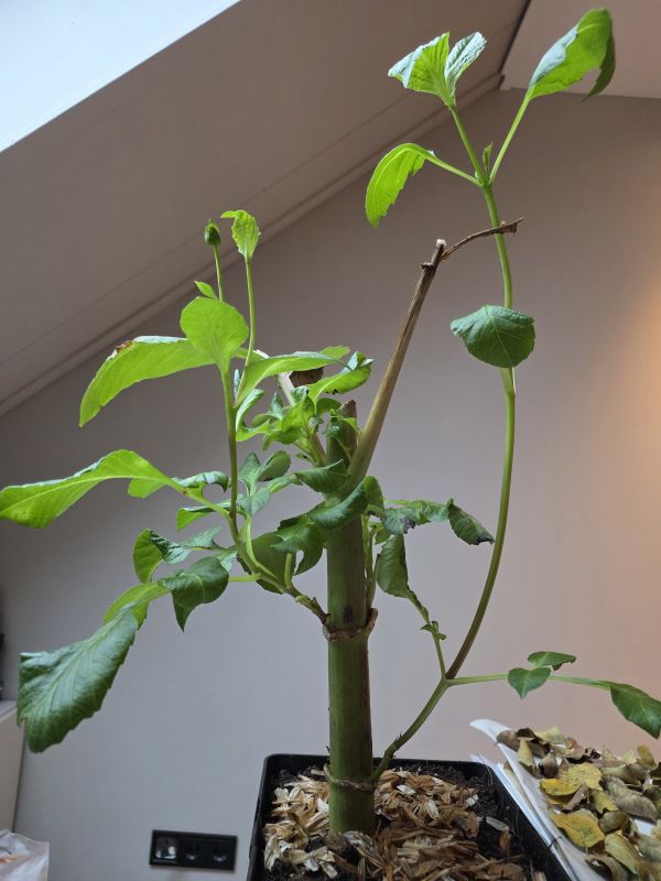 De eerder met een storm afgebroken dahlia had ik een paar weken geleden naar 5L opgepot en binnen gezet. Deze staat onder een schuin dakraam, maar heeft blijkbaar toch wat weinig licht. Er zit wel een klein bloemknopje in, hopelijk geeft die een mini bloemetje. Nu een mooi wortelgestel vormen en dan volgend jaar echt knallen. Sinds een dag of 2 komen er echter helaas veel varenrouwmugjes vandaan vliegen, heb er de afgelopen 2 dagen al enige tientallen te pakken gekregen.