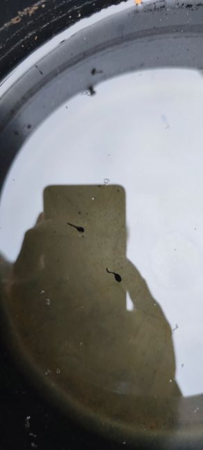 Achter onze achtertuin loopt een pad (in de zin van trottoir) met daarachter een groenstrook en een plas water (erg verbrede sloot). Daar had ik al eerder met een emmer water uit gehaald om de planten te bewateren. Zo ook 2 dagen geleden. Vandaag ging ik weer wat planten met een bekertje bewateren (van het water van 2 dagen geleden), maar zag ik enkele kikkervisjes (of paddenvisjes) in de emmer zitten. Toch wel leuk! Het zijn er meer dan 10.